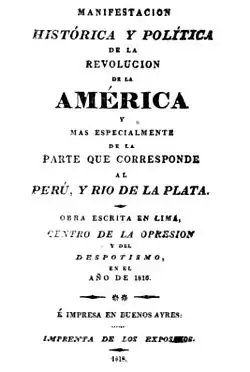 In 1816 he wrote a Manifestación histórica y política de la revolución de América, published anonymously in Buenos Aires in 1818 in which he exposed 20 causes justifying the insurgency against the colonial regime.
