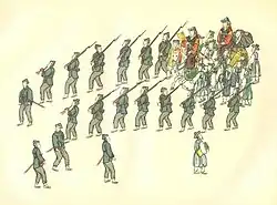 In 1881, Gojong and Min spearheaded the military modernization efforts. Joseon dispatched the so-called Gentlemen's Sightseeing Group to Japan or Courtiers' Observation Mission (Sinsayuramdan). They invited the Japanese Army attaché Lieutenant Horimoto Reizō to serve as an adviser in creating a modern army.[1] The Japanese gave military training to eighty to one hundred young men of the aristocracy, establishing the Special Skills Force (Pyŏlgigun, Korean: 별기군).[2] They also sent a royally appointed advisor (Yeongseonsa) and students to Tianjin to learn about the manufacture of firearms and munitions. In January 1882, the government reorganized the Five Army Camps (ogunyeong) into the Palace Guards Garrison (Muwiyŏng, Korean: 무위영) and the Capital Guards Garrison (Changŏyŏng, Korean: 창어영).[2] However, these units were resentful towards the Special Skills Force for better treatment and equipment. Additionally, the army discharged more than 1,000 soldiers in overhauling the military; most were old or disabled. The army did not pay them in rice for thirteen months leading up to the Imo Incident, which claimed the lives of some Japanese military advisors and their legislation and some Joseon officials. Daewongun returned to power momentarily to restore order. Daewongun dismantled the Muwiyŏng, the Changŏyŏng, and the Pyŏlgigun and revived the Five-Army Camps.[3][4] In December 1882, after Daewongun's arrest, the government disbanded the Five-Army Camps once more. The Chinese lines under Yuan Shikai reorganized and trained into a new Joseon military formation, the Capital Guards Command (Chingunyeong, Korean: 친군영).[5][6]