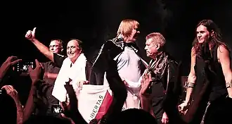 The shows were held at 6 and 8 p.m. to a sold out audience of 3,000 each; both shows lasted for one hour and forty minutes.[20][21][13] Wakeman was unable to secure two seats for his parents, and resorted to buying a pair for £15 from a ticket tout.[20] A screen placed above the stage was used to present stock footage of mountains and underground caves at first, until 20th Century Fox granted permission to use clips from the 1959 American film adaptation.[21][5] Plans to film the concerts for a prospective home video release fell through.[13] Bassist Roger Newell recalled several politicians, John Lennon, Yoko Ono, Paul McCartney, Yes guitarist Steve Howe, and Peter Sellers in attendance.[22] Hemmings sat on a throne with the narrative script on his lap. He had a black eye at the time, after his wife found out he had cheated on her and had hit him. Wakeman's then-wife administered makeup to disguise the bruising.[3][21]