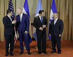 Hernández with US Vice President Joe Biden, Guatemalan President Jimmy Morales, and Salvadoran President Salvador Sánchez Cerén, 2016