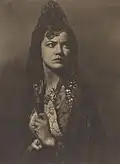 He was elected an honorary fellow of the Royal Photographic Society.[49] In his early history of the medium in Australia Jack Cato asserted that Smith "had no superior in any part of the world".[50] His portraits are in an outmoded Pictorialist style in a period of the emerging New Photography,[51][52] artistically lit with orchestrated, sometimes melodramatic, poses,[53] and printed with radical overexposure in pyrocatechin developer and bleaching-back with ferricyanide.[50] In his more contrived, but popular,[52] 'character study' tableaux the subject may be costumed as a protagonist from Dickens, Shakespeare, or from nursery rhymes.
