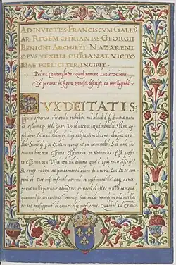 During his legation of 1507–1509 to Germany, Dragišić edited for publication the Homelia doctissima of Cardinal Carvajal, adding a dedicatory letter to Maximilian I.[18] During this period he also wrote Vexillum christianae victoriae, a treatise divided into 63 "contemplations" on divine simplicity and related Trinitarian topics, still trying to demonstrate concord between Scotism and Platonism.[19] Originally dedicated to Maximilian, who received a copy (now MS Palat. 4797 in the Austrian National Library), a new copy was dedicated to King Francis I of France in 1517 (now MS Lat. 3620 in the National Library of France). There are two other undedicated manuscripts.[18]