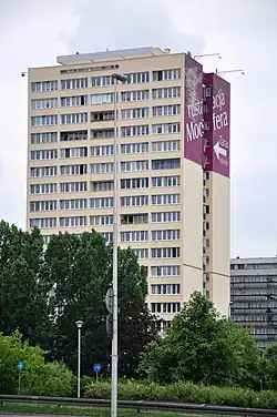 The neighbourhood features three identical multi-family residential buildings, each with 18 floors.[17] Their addresses are 1 and 3 Promyk Street and 2 Koźmiana Street.[4] The buildings were constructed using monolithic technology with a climbing formwork method.[7] The design and subsequent construction process was an experiment to test the possibility of building taller structures using this method, as well as to explore the potential of using prefabricated facade elements.[9] In the early years of operation, the buildings experienced problems with leaks in the walls and roof, leading to the need for roof replacements.[5] The repeatable design tested on Kępa Potocka was later adapted and used in the design of a building for employees of the Staszic Mine in Katowice (Górnik I).[9][21]