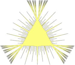 What remains is to compute the area of the final shape. Due to difficulty and length constraints the final argument cannot be fully included. Instead, an example will be shown. Looking at the figure, it can be seen that the 2n subtriangles overlap a lot. All of them overlap at the bottom, half of them at the bottom of the left branch, a quarter of them at the bottom of the left left branch, and so on. Suppose that the area of each shape created with i merging operations from 2i subtriangles is bounded by Ai. Before merging two of these shapes, they have area bounded be 2Ai. Then, move the two shapes together such that that they overlap as much as possible. In the worst case, these two regions are two 1 by ε rectangles perpendicular to each other so that they overlap at an area of only ε2. But the two shapes that we have constructed, if long and skinny, point in much of the same direction because they are made from consecutive groups of subtriangles. The handwaving states that they over lap by at least 1% of their area. Then the merged area would be bounded by Ai+1 = 1.99 Ai. The area of the original triangle is bounded by 1. Hence, the area of each subtriangle is bounded by A0 = 2-n and the final shape has area bounded by An = 1.99n × 2-n. In actuality, a careful summing up of all areas that do not overlap gives that the area of the final region is much bigger, namely, 1/n. As n grows, this area shrinks to zero. A Besicovitch set can be created by combining six rotations of a Perron tree created from an equilateral triangle. A similar construction can be made with parallelograms.