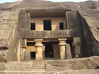 The Kanheri Caves (Kānherī-guhā [kaːnʱeɾiː ɡuɦaː]) are a group of caves and rock-cut monuments cut into a massive basalt outcrop in the forests of the Sanjay Gandhi National Park, on the island of Salsette in the western outskirts of Mumbai, India. They contain Buddhist sculptures and relief carvings, paintings and inscriptions, dating from the 1st century CE[1] to the 10th century CE. Kanheri comes from the Sanskrit Krishnagiri, which means "black mountain".[2]