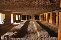 The site is on a hillside, and is accessible via rock-cut steps. The cave complex comprises one hundred and nine caves. The oldest are relatively plain and unadorned, in contrast to later caves on the site, and the highly embellished Elephanta Caves of Mumbai. Each cave has a stone plinth that functioned as a bed. A congregation hall with huge stone pillars contains a stupa (a Buddhist Pagoda). Rock-cut channels above the caves fed rainwater into cisterns, which provided the complex with water.[3] Once the caves were converted to permanent monasteries, their walls were carved with intricate reliefs of Buddha and the Bodhisattvas. Kanheri caves were built in the 1st century and had become an important Buddhist settlement on the Konkan coast by the 3rd century CE.[4]
