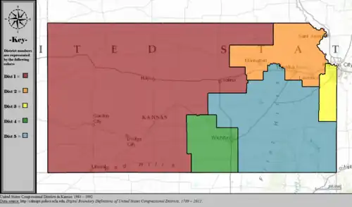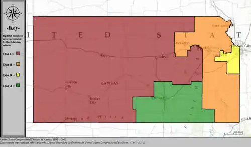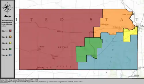 Table of United States congressional district boundary maps in the State of Kansas, presented chronologically.[3] All redistricting events in Kansas between 1973 and 2013 are shown.