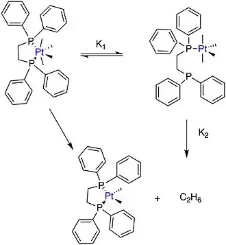 A platinum tetramethyl complex undergoes elimination of a molecule of ethane by way of its chelating bidentate ligand.