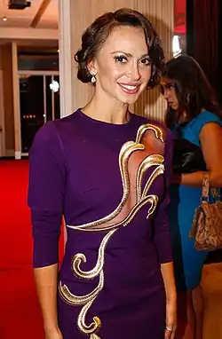 Karina Smirnoff[a] (born Karina Smyrnova[b], January 2, 1978)[1][2] is a professional ballroom dancer.[3] She is known as a professional dancer on Dancing with the Stars, where she won the thirteenth season with army veteran and soap opera star J. R. Martinez. She has also won two runner-up titles, a semifinal title, and several quarterfinal titles.