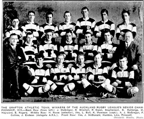 Ifwersen then switched codes to rugby league, joining the North Shore Albions where he debuted for them on 3 May 1913. He scored a try in a 13–10 win over the reigning champions Newton Rangers.[3] He played for Auckland before representing his club and made the 1913 New Zealand tour of Australia. The following year he joined the newly formed Grafton Athletic senior team. He performed outstandingly for them and led the competition in scoring in 1914 with 66 points and in 1915 with 78 points which greatly assisted Grafton in winning their first ever championship. Indeed, he scored 146 of their 193 points in those two seasons. In the 1916 season he once again led the league in scoring with 56 points however the 1917 season was to be a frustrating one with his Grafton team struggling for playing numbers and they were forced to default matches before dropping out of the competition. In 1918 though he again was prolific, scoring 4 tries, and kicking 27 goals for 66 points to lead the league in scoring for a remarkable 5th season out of six. He also represented Auckland in their first match in a number of years and he scored 2 tries and kicked 4 goals in a 45–9 win over Canterbury in front of 10,000 spectators at the Auckland Domain.[4]