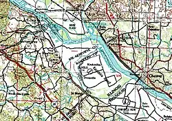 Most of the town was destroyed by flooding in April 1881 when the Mississippi River shifted eastward to a new channel, taking over the lower 10 mi (16 km) of the Kaskaskia River.[3] This resulted from deforestation of the river banks during the 19th century, due to crews taking wood for fuel to feed the steamboat and railroad traffic.[3] The river then passed east rather than west of the town. The state boundary line, however, remained in its original location. A small bridge crosses the old riverbed, which became a creek that sometimes fills with water during flood season.