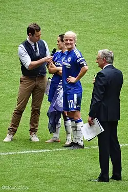 In January 2014, Chelsea announced the double transfer of Chapman and Gilly Flaherty from Arsenal. The move reunited Chapman with Emma Hayes, her coach from Arsenal and Chicago. She hoped that training more regularly with Chelsea would kick start her international career.[37] In August 2015 Chapman captained Chelsea in their FA Women's Cup final against Notts County, the first time the event had been staged at Wembley Stadium.[38] She described the experience as "overwhelming".[39] Chelsea's 1–0 win before a Cup final record 30,710 crowd secured the club's first major trophy. It was the ninth FA Women's Cup winner's medal of Chapman's career.[40] In October 2015 she played in Chelsea's 4–0 win over Sunderland which secured the club's first FA WSL title and a League and Cup "double".[41]