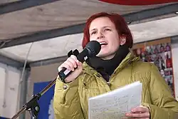 Kipping was a chief representative of the young progressive generation who sought to renew the party and place emphasis on environmentalism, social justice, and social movements.[1][4][5] She was a principal proponent of a united left party, comprising the east-oriented PDS and the west-oriented Labour and Social Justice (WASG). The two parties formed a joint list for the 2005 federal election, and Kipping was elected to the Bundestag as a representative for Saxony. The PDS and WASG merged to form The Left in June 2007, and Kipping was elected deputy chairperson of the new party.[1] She was re-elected to the Bundestag in 2009 and became chairwoman of the Committee for Labour and Social Affairs.[6]