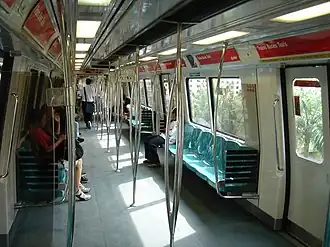 All cars were retrofitted with 6 LCD Displays per car and all except trainset 347/348 which featured Visual Passenger Information System displays from July 2001 to September 2009. These used to show rail travel information, commercials and movie trailers. The C751B was also the first train to have wheelchair spaces, with the retrofitting of the elevators in the MRT stations, which also began in 2000. The interior design was also improved; the seats were now 48 cm wide - about 5 cm wider than on previous train types. The STARIS version 2.0 was piloted on train car 3322 in 2010, but it was uninstalled in 2016 as it was not compatible with the updated STARIS displays.