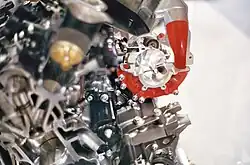 Cutaway H2R engine and supercharger. Orange painted plenum surrounds impeller, behind which is visible part of planetary gear system.