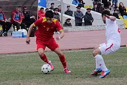 Sharipov (left) in action during the 2014 AFC Challenge Cup qualification match against Tajikistan