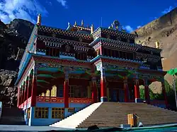The Tangyud (Tang-rGyud) Gompa of village Komik dates to the early 14th century and is built like a fortified castle with massive slanted mud walls and battlements with vertical red ochre and white vertical stripes. It is on the edge of a deep canyon and overlooking the town of Kaza, 4 km from the town.[2][3] Kaza hosts a branch of the Tangyud Gompa.