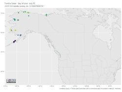 An animation of tagged tundra swan movements, where individuals can be seen in the Mackenzie Delta area in June through September.