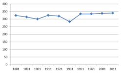 Since 1881, the population of Kexby has remained relatively steady, never exceeding a total of 350. Unlike a majority of villages in the UK, Kexby seems to be unaffected by the events of World War 1. The population only decreased by 5 between 1911 and 1921, from 325 to 320.[17] As of 2011, the total population of Kexby is 340.[18] The age range in the population of Kexby is quite diverse; the census data for 2011 highlights this. The most populous age ranges seems to be from 40 to 49 and 60–69, but for a village like Kexby there also seems to be a healthy proportion of other younger and older generations.[19]