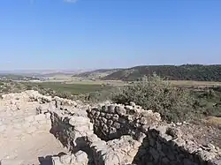 Khirbet Qeiyafa (Arabic: خِرْبَة قِيَافَة, romanized: Khirbat Qiyāfa), also known as Elah Fortress and in Hebrew as Horbat Qayafa (Hebrew: חוֹרְבָת קַייָאפַה),[1] is the site of an ancient fortress city overlooking the Valley of Elah and dated to the first half of the 10th century BCE.[2][3] The ruins of the fortress were uncovered in 2007,[4] near the Israeli city of Beit Shemesh, 30 km (20 mi) from Jerusalem.[5] It covers nearly 2.3 ha (6 acres) and is encircled by a 700-meter-long (2,300 ft) city wall constructed of field stones, some weighing up to eight tons.[6] Excavations at site continued in subsequent years.[7] A number of archaeologists, mainly the two excavators, Yosef Garfinkel and Saar Ganor, have claimed that it might be one of two biblical cities, either Sha'arayim, whose name they interpret as "Two Gates", because of the two gates discovered on the site, or Neta'im;[8] and that the large structure at the center is an administrative building dating to the reign of King David, where he might have lodged at some point.[9][10] This is based on their conclusions that the site dates to the early Iron IIA, ca. 1025–975 BCE,[11] a range which includes the biblical date for the biblical Kingdom of David. Others suggest it might represent either a North Israelite, Philistine, or Canaanite fortress, a claim rejected by the archaeological team that excavated the site.[12] The team's conclusion that Khirbet Qeiyafa was a fortress of King David has been criticised by some scholars.[11] Garfinkel (2017) changed the chronology of Khirbet Qeiyafa to ca. 1000–975 BCE.[13][14]
