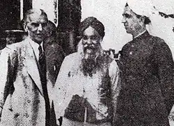 Like Sikandar, Tiwana was staunchly opposed to the idea of Pakistan created by the Muslim League, yet unlike his predecessor was less willing to compromise or bow to the dictation of its leader Muhammad Ali Jinnah.[12] Jinnah increasingly sought to enforce the Sikandar-Jinnah pact and wield influence over the government claiming that as the Muslims of the Unionist party also belonged to the Muslim League, the Punjab government was a League government and should submit to directives of the Muslim League leadership.[12] In April 1944 Jinnah demanded that the name of the Unionist Party be changed to the Muslim League Coalition Party.[13] Tiwana rebuffed these demands asserting that his government was a coalition between Muslims, Hindus and Sikhs, rather than a Muslim League government[12] Tension with Jinnah simmered until Tiwana was expelled from the Muslim League later that year.[12] This opened a rift within the Unionist Party, with Muslim members now forced to choose between Tiwana and the Muslim League.[12] Following this clash, the Muslim League waged an increasing vitriolic campaign against him, denouncing him as a 'quisling' and 'kafir'. Mock funerals were held outside his official residence and he was greeted wherever he went with black flags of protest.[14]