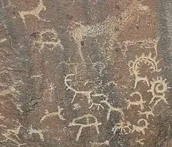 Originating in the Paleolithic period, the rock art found in Khoit Tsenkher Cave includes symbols and animal forms painted from the walls up to the ceiling.[1] Stags, buffalo, oxen, ibex, lions, Argali sheep, antelopes, camels, elephants, ostriches, and other animal pictorials are present, often forming a palimpsest of overlapping images. The paintings appear brown or red in color, and are stylistically similar to other Paleolithic rock art from around the world but are unlike any other examples in Mongolia.