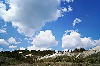 The park centers on the Khvalynsk Mountains, a raised plateau that stretches along the west bank of the Volga River (referred to as the 'Right Bank'). Because the bedrock is primarily chalk and marl, the landform reflects extensive erosion out from the center of the ridge, with undulating and hilly terrain and numerous interconnected ravines and gullies. The varied landforms create many micro-climates and habitats. The highest mountain (Belenkaya, almost entirely of chalk) is 369 meters in altitude, and there are five other mountains over 250 meters in height. The mountains in the park are mostly covered with upland forest trees.[1] The Volga reaches its greatest depths (22 meters) in the territory of the park.[2]