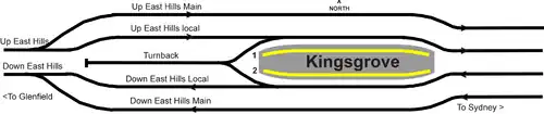 In 2000, as part of the quadruplication of the line from Wolli Creek to just west of Kingsgrove station, through lines were added on either side of the existing pair. A headshunt was provided to the west of the station in association with this project, this is used by terminating services. In 2013, the quadruplication was extended to Revesby as part of the Rail Clearways Program.[5]