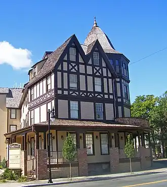 - Kirkland Hotel, 2 Main Street. One of the district's newest contributing properties, this 1899 Tudorbethan hotel is a rare example of a wood-frame urban hotel. After almost three decades of vacancy, it was recently restored for mixed commercial and residential use by a local nonprofit group.[32]