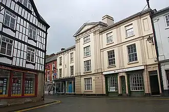 In the 1870s, an assessment was thus: "The trade of the town is chiefly with the agriculturists of the adjoining county of Radnor. There are two banking establishments, viz., the head offices of the Kington and Radnorshire bank (Messrs. Davies, Banks, & Davies), established in 1808, and a branch of the Midland Banking Company, Limited. There is an extensive iron foundry, nail, and agricultural implement manufactory carried on by Messrs. James. Meredith & Co., and the building and tanning trades are well represented. There are also some extensive corn mills and malt-houses. About four miles west of the town are the Old Radnor lime rocks, which are celebrated for their superior quality for building and for agricultural purposes. The market day is Tuesday, considerable business being transacted on that day in eggs, butter, poultry, &c., and is the mart to which the Welsh send their produce, to meet dealers who frequent this town from all quarters."[16]