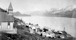 North arm of Kootenay Lake as seen from the village of Ainsworth around 1890.