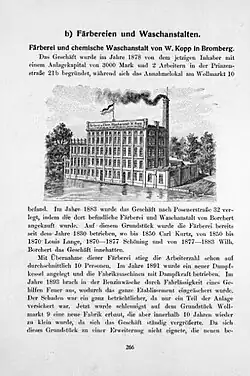 With its growing activity in the 1910s, Kopp's company was one of the largest dyeing firms in eastern German Empire. It had branches in nearby cities (Chełmno, Grudziądz, Inowrocław, Toruń) and employed around 60 people.