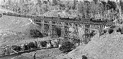 In 1895 a wrought iron replacement of the viaduct was put out to tender.[48] It was won by J & A Anderson & Co of Christchurch in 1896 for £4,728,[49] though in 1899 the cost was put at £6,684, presumably including the approach banks.[38] In the same era Andersons also rebuilt Makotuku (1898), Matamau (1899), Mangatera (1900), Ormondville (1904) and Makatote (1908) viaducts.[50] Floods and earthquakes created problems with the approach banks, closing the line for about 4 days in 1896.[51][52] An earthquake was noted as early as 1878.[53] The approach to the viaduct slumped about a foot in the 1904 earthquake[54] and the viaduct was damaged in the 1931 quakes[55][56] On 12 September one of the piers subsided[57] and on 18 September 1932 some 200 ft (61 m) of the northern approach sank about 20 ft (6.1 m), was closed for repairs for 5 days[58] and then a washout occurred about a month later,[59] after a new approach had been built.[60] The bank approaching the viaduct also subsided slightly in a 1934 quake.[61] During another earthquake in 1938, a train was crossing, but the viaduct was undamaged.[62] Pier 5 was underpinned in 1983.[63]