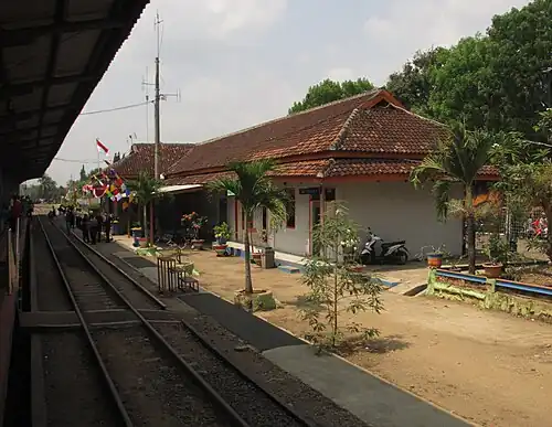 The station has three lines and three platforms, with the Line 2 being the straight line. The station used to have fourth line, but it was dismantled. There's a small disused locomotive shed to the northwest of the station. The station's facility includes waiting room, lactation room, clinic, ticket counter, toilet, musalla and parking space.