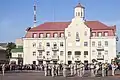The last name that is most common is Red Square. The origin of the word "red" is not from the color of the pavement, which the center has been covered since 1935, but from the Slavic adjective "red, which means beautiful." On the map of the city, dated 1930, you can find the name "Red Square" in Ukrainian. Locals are accustomed to calling the center by any of the above.[3] Always in the same year after a major reconstruction of the square from which the city bazaar was removed, and in order to honor the memory of the late Bolshevik functionary V. Kuibyshev, the square was named after him. In December 1941, the square was named after Hetman I. Mazepa. Mazeppa Platz, and in the fall of 1943 the previous name was returned - Kuibyshev Square.The area where the square is located today has been the main market of the city since the times of Russia. Later, when Chernihiv after the destruction of the Tatar-Mongols significantly decreased in size, trade was conducted on the territory of the fortress, and after its liquidation, in 1799, again moved to the area, which at that time was referred to as the Friday Field; later the area was named Bazarnaya, then - Krasnaya. From the middle of the 19th century. part of the square was designated as Theatrical.At the beginning of the 19th century on the square built shopping malls with colonnades-galleries, in which local merchants opened their shops. The shopping malls were dismantled in the first half of the 1930s, and in 1935 the square, like all the main streets of the city before that, was paved with red and yellow clinker, and a square was laid out near the Friday Church. In 1959, the Chernihiv Regional Academic Ukrainian Music and Drama Theater named after Taras Shevchenko was opened on the square.[4]