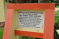 Reverend Krishna Mohan Banerjee died on 11 May 1885 in Kolkata, and was buried at Shibpur with his wife. The graveyard is currently located inside the campus of IIEST.[6]