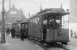 The second generation of electric trams, Class SS, were delivered in 1913 and 1914. The thirty-seven trams were significantly larger due innovations allowing longer wheelbases.[20] By 1915 the street tram network consisted of thirteen services, of which two were operated by KES and six were joint operations. The joint services were operated the relative number of trams in proportion of the ownership of trackage along the line and where each company simply kept the revenue it created on their services.[35] The first women conductors were hired in 1916.[36] The Stephenson and Skabo horsecar trailers were taken out of service in 1917 and 1918. Sixteen were sold to the Bergen Tramway and the Trondheim Tramway.[37]