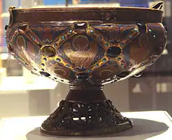 Examples are known of the incorporation of Kufic script and Islamic-inspired colourful diamond-shaped designs such as a 13th French Limoges enamel ciborium at the British Museum.[8] The band in pseudo-Kufic script "was a recurrent ornamental feature in Limoges and had long been adopted in Aquitaine".[9]