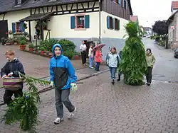 Every Pentecost Monday, an older boy is selected as the Pentecost bearer who is taken to the forest and is there so densely covered with ferns and willows that he is unrecognizable and can hardly walk. The ferns are collected by the so-called dividers, made up of boys who took part in the Pentecostal ritual in the previous year. The bearer's costume includes a tail about 6 feet long, which is carried by the younger boys. He is led into the village while singing the taunt. He is preceded by a boy who carries a bell on a long stick who thus announces the Pentecost. The dividers collect small gifts from the residents. At the end, the Pentecostal bearer is led back into the forest and relieved of his costume.