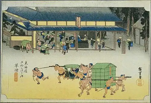 Utagawa Hiroshige's ukiyo-e Hōeidō edition print of Kusatsu-juku dates from 1833 -1834. The print depicts a busy scene within the post station itself in front of the open-fronted Yōrō-tei (養老亭) tea house in which many patrons are enjoying Ubagamochi (姥が餅), a sweetened sticky rice cake which was a speciality of Kusatsu-juku. The tea house was so named by Tokugawa Ieyasu after he stopped here following his victory at the Battle of Sekigahara and was presented with a rice cake by proprietor, an 84-year old former wet nurse of the Sasaki clan who had escaped the destruction of her clan at the hands of Oda Nobunaga. Afterwards, the tea house was mentioned by Matsuo Basho, Yosa Buson and other noted travelers. In front of the tea house, on the highway itself, a passenger in an open kago (palanquin) holds on to a rope as the porters rush to his destination, while a larger, covered kago, presumably for a high status passenger, heads in the opposite direction.