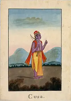 Kusha (Sanskrit: कुश, IAST: Kuśa) and his younger twin brother Lava were the children of Rama and Sita.[1] Their story is recounted in the Hindu epic, the Ramayana. Hindu traditions claim he ruled the entire region of Kashmir, Indus River and Hindu Kush as frontier lands of India known as Hindu Kush Kshetra and founded the city of Srinagar in the Kashmir Valley and Kasur with Lavapuri of Lava in base lands,[2] though local lore contends Kasur was founded in 1525 by Pashtun migrants.[3][4][5] His brother Lava is traditionally believed to have founded Lavapuri (current day city of Lahore).