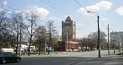 The Kyiv Television Center, or The Pencil, is a modernist skyscraper in Kyiv, and the current symbolic headquarters of Ukrainian public television broadcasting (it has been empty since the invasion).[1] The inception for the building occurred sometime in the 1960s, but its construction was delayed until 1983. It was built on the site of an old Jewish cemetery, which was removed in the 1970s.[2]