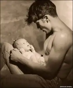 SubjectMonochrome studio shot of a semi-naked male model cradling a baby