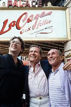 La Cage aux Folles opened on Broadway at the Palace Theatre on August 21, 1983. It was directed by Arthur Laurents and choreographed by Scott Salmon, with set design by David Mitchell, costume design by Theoni V. Aldredge, and lighting design by Jules Fisher. The original Broadway cast included Gene Barry as Georges and George Hearn as Albin, with John Weiner as Jean-Michel, Jay Garner as Edouard Dindon, Merle Louise as Mme. Dindon, Elizabeth Parrish as Jacqueline, Leslie Stevens as Anne, and William Thomas Jr. as Jacob.[16] Among the replacement performers who appeared in La Cage aux Folles during its original Broadway run were Walter Charles, Keene Curtis, Van Johnson, Peter Marshall, Keith Michell, Jamie Ross and Lee Roy Reams.[16] The original production received nine Tony Award nominations, winning a total of six including Best Musical, Best Original Score and Best Book of a Musical. The show beat several strong competitors in many categories, including Stephen Sondheim's Sunday in the Park with George. It also won three Drama Desk Awards. The production ran for four years and 1,761 performances, closing on November 15, 1987.[16]