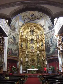 The central focus of the church is its main altar with altarpiece, flanked by two choirs. In the central section of the main altarpiece are images of the Holy Sacrament, the Our Lady of the Pillar, Ignatius of Loyola, and Benedict of Nursia. These sculptures are made from glue-soaked cloth.[8] The church also has six side altarpieces, all of which are done in the 18th-century Mexican Churrigueresque style using estipite (inverted truncated pyramid) columns.[2]