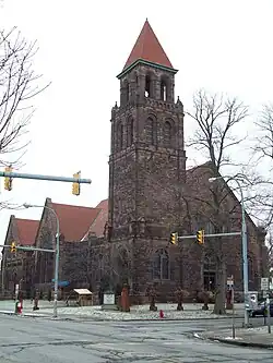 Lafayette Avenue Presbyterian Church is a historic Presbyterian church complex located at 875 Elmwood Ave, Buffalo in Erie County, New York. The church is part of the Presbytery of Western New York which is part the Synod of the Northeast, a regional body of the Presbyterian Church (USA). The complex consists of the large cruciform-plan church building that was built in 1894 with an attached rear chapel. Adjoining them is the Community House that constructed of brick in the Tudor Revival style, that was built in 1921. The main church building is constructed of Medina sandstone with a terra cotta tile roof in the Romanesque Revival style. It features a 120-foot-tall (37 m), square bell tower with a pyramidal roof.[2] The church cost $150,000 to build and has a capacity of 1,000 people