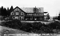 The two-story wood-frame structure replaced a previous building on the site that was built by Jack Ewell. Alfred and Ransom Higley bought it from Jack Ewell the original builder in 1905. Subsequently it was taken over from them by Herbert Olson in about 1907.[2] The Olsons sold their interest in the first hotel to the Seaman family in 1921. On August 24, 1924, the original hotel burned.[3]