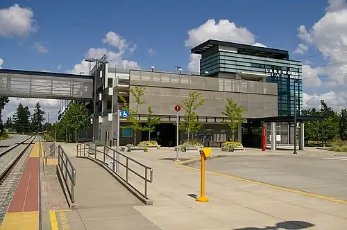 Lakewood station is a commuter rail station in Lakewood, Washington, United States. It is the terminus of the S Line of the Sounder commuter rail network, operated by Sound Transit in the Seattle metropolitan area. The station, located along Pacific Highway Southwest, includes a 620-stall parking garage and several bus bays served by Intercity Transit and Sound Transit Express. Lakewood station was originally scheduled to open in 2002 as part of a Sounder extension, but plans were delayed due to funding issues and the state government's work on the Point Defiance Bypass project. Construction on the $33 million station and garage began in March 2007 and it opened for use by buses on September 18, 2008. Sounder service to Lakewood began in October 2012 and the pedestrian bridge opened a few months later.