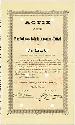 The Langenthal–Huttwil railway is a single-track standard-gauge line in Switzerland and currently operated by BLS AG. It was built by the Langenthal-Huttwil-Bahn (LHB) and opened in 1889. On 1 January 1944, the LHB was merged into the Vereinigte Huttwil-Bahnen (United Huttwil Railways, VHB), which was later merged into BLS AG.