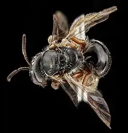 The sweat bee genus Lasioglossum is the largest of all bee genera, containing over 1800 species in numerous subgenera worldwide.[1][2] They are highly variable in size, coloration, and sculpture; among the more unusual variants, some are cleptoparasites, some are nocturnal, and some are oligolectic. Most Lasioglossum species nest in the ground, but some nest in rotten logs.[3]